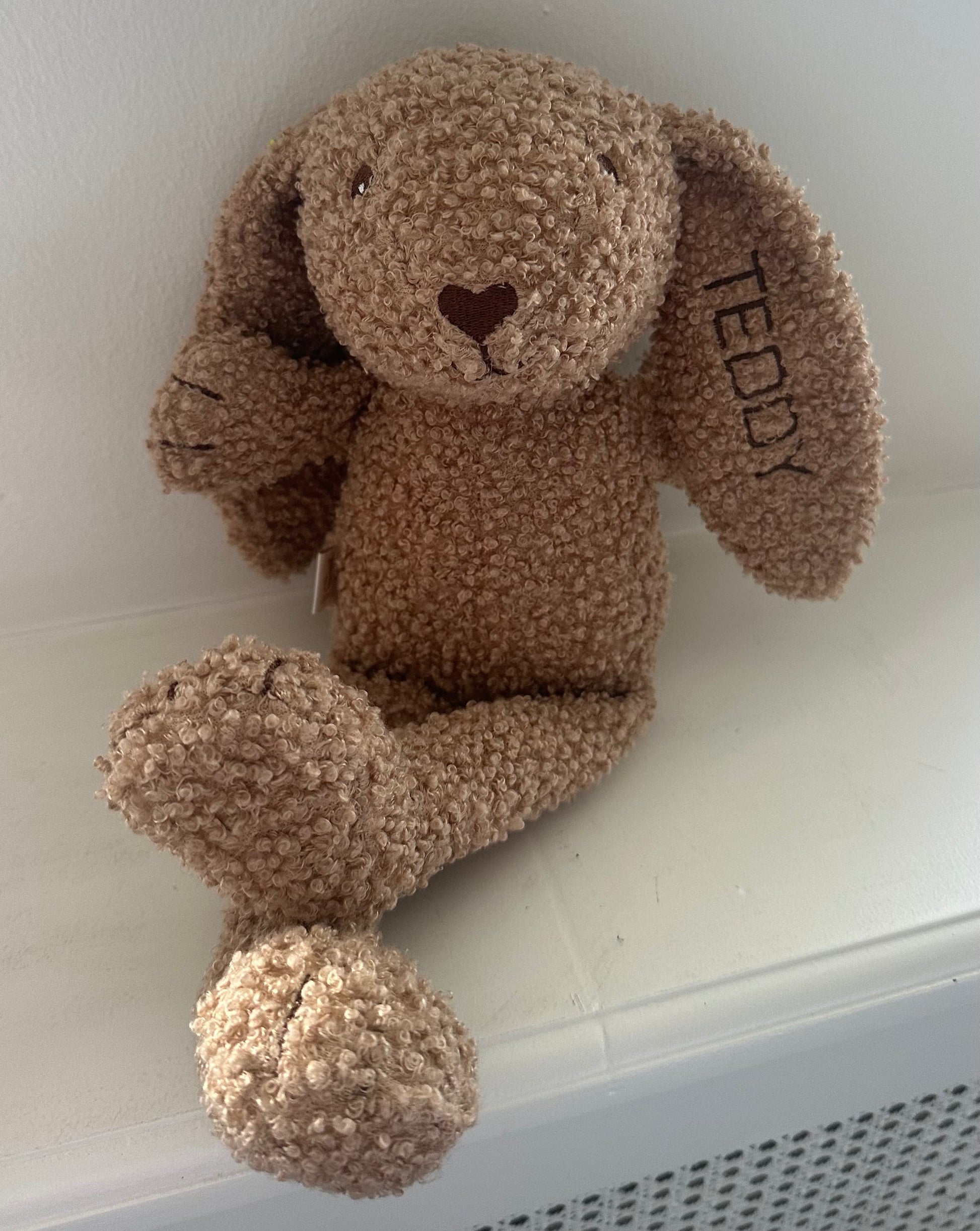 Dit onweerstaanbare konijntje in warme biscuittint is gemaakt van een heerlijk zachte bouclé stof perfect om vast te houden, te koesteren en eindeloos mee te knuffelen. De lieve geborduurde oogjes, het subtiele hartvormige neusje en de lange oren geven dit vriendje een eigen karakter.