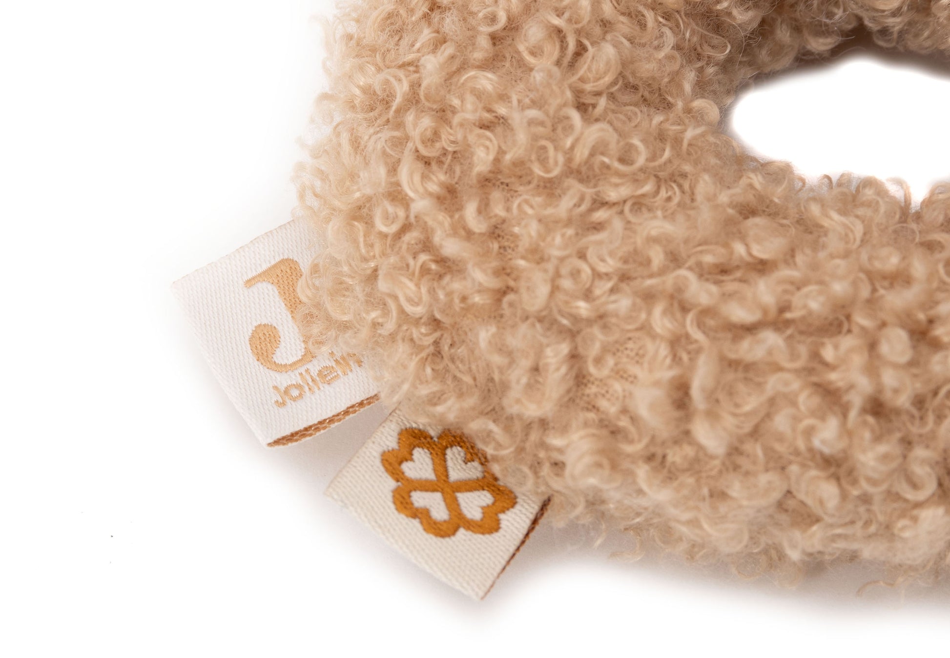 Deze schattige rammelaar in konijnvorm is ontworpen om de zintuigen van jouw baby te prikkelen én te troosten. Gemaakt van een heerlijk zachte bouclé stof in biscuitkleur, met een geborduurd hartvormig neusje en een subtiel rinkelend geluidje bij elke beweging. Perfect om te grijpen, te schudden én om mee te knuffelen.