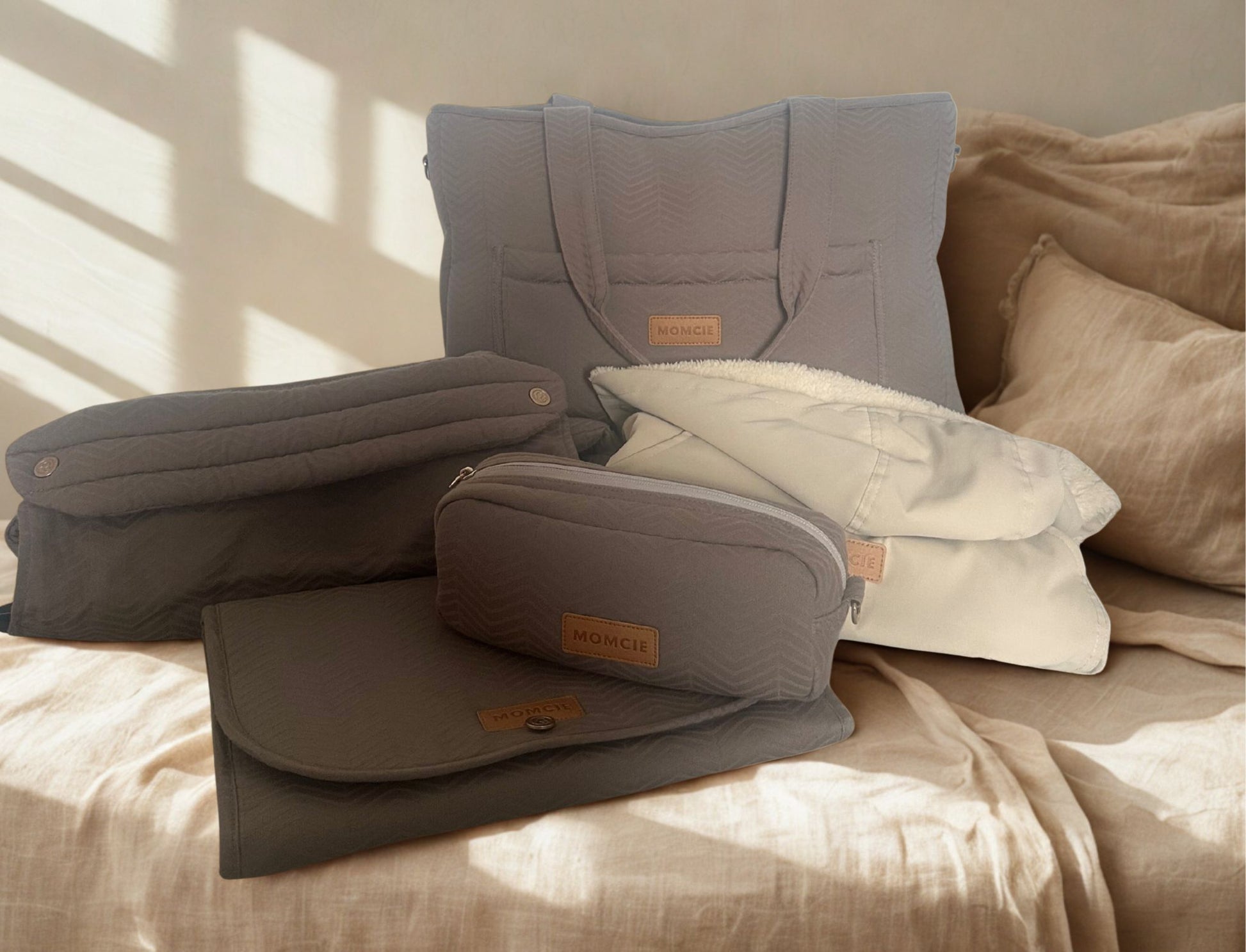 Complete MOMCIE set met de Cocoon draagzak, Baby Carrier Cover, Mom Bag, Pouch en Verschoningsmat. De set heeft een waarde van €550 en is ontworpen met zachte, baby-veilige materialen voor stijl, veiligheid en verbondenheid. Alles in één keer compleet: start zorgeloos, stijlvol en dichtbij.
